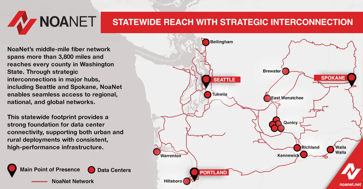 NoaNet provides high-capacity, carrier-grade connectivity to key data centers across Washington State and major interconnection points in the Pacific Northwest. Our network is engineered to support mission-critical applications, delivering the reliability, scalability, and performance required by enterprises, carriers, public sector organizations, and cloud providers.